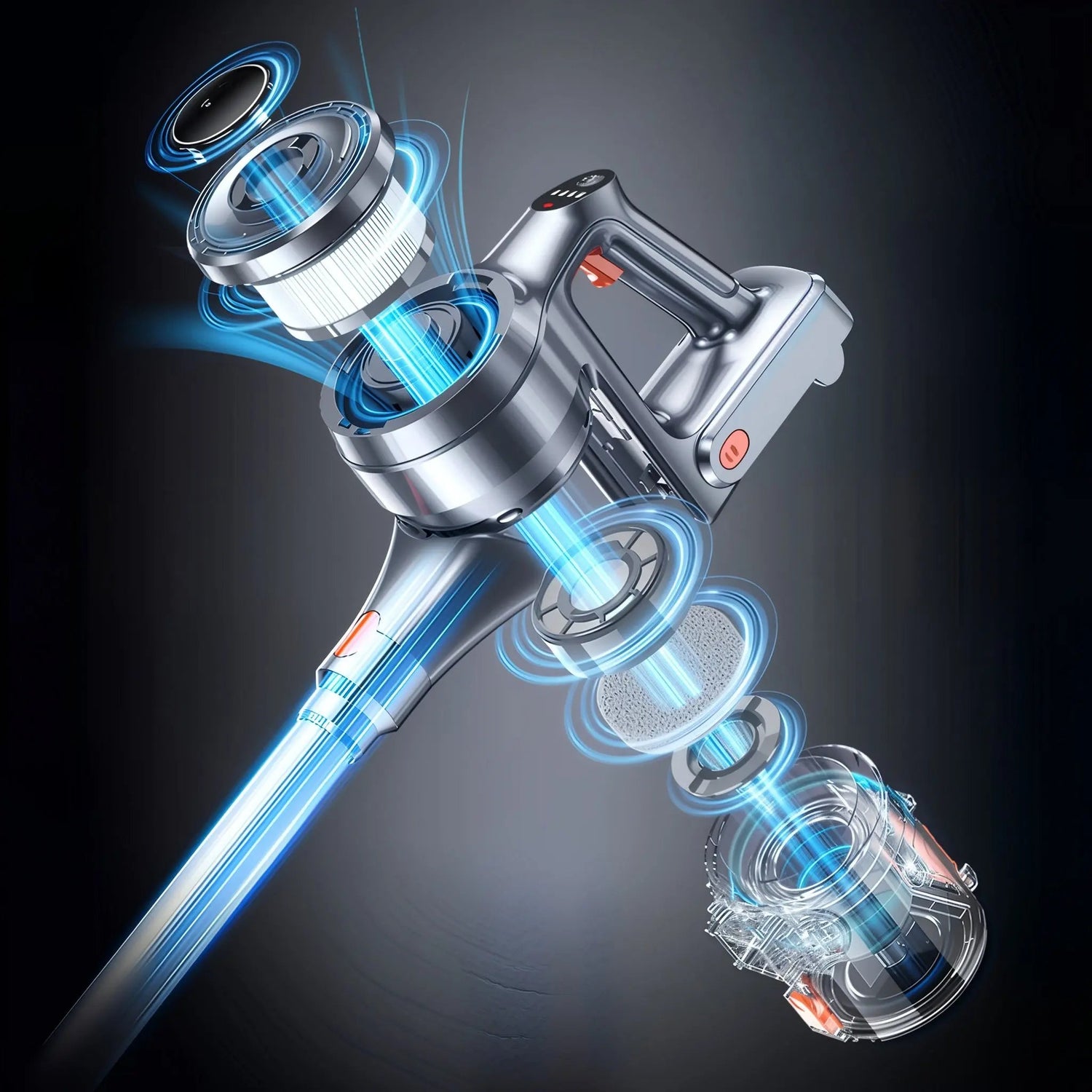Le système cyclonique à 5 niveaux garantit une filtration ultra-efficace : HEPA, coton, éponge, inox et cyclone capturent 99,9 % des poussières et microparticules, tout en expulsant un air plus frais pour votre intérieur.