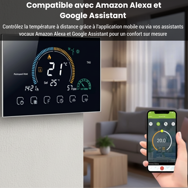 Un thermostat intelligent régule la température de votre maison via Wi-Fi, et peut être contrôlé à distance via une application mobile ou des commandes vocales (Google Assistant, Alexa).